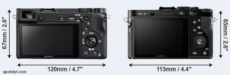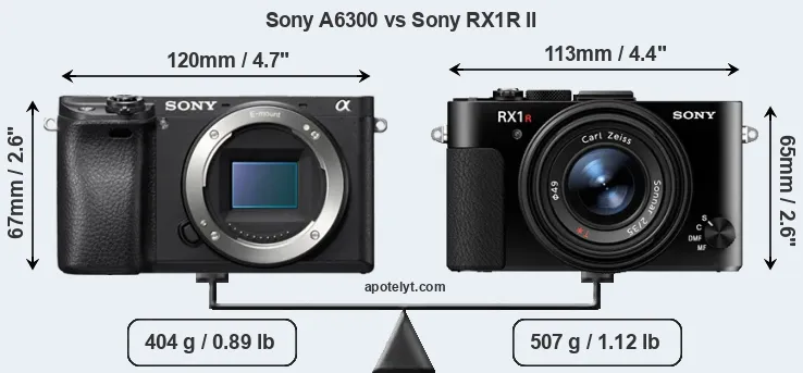 The side-by-side display below illustrates the physical size and weight of the Sony A6300 and the Sony RX1R II. The two cameras are presented according to their relative size. Three consecutive perspectives from the front, the top, and the back are available. All width, height and depth measures are rounded to the nearest millimeter.