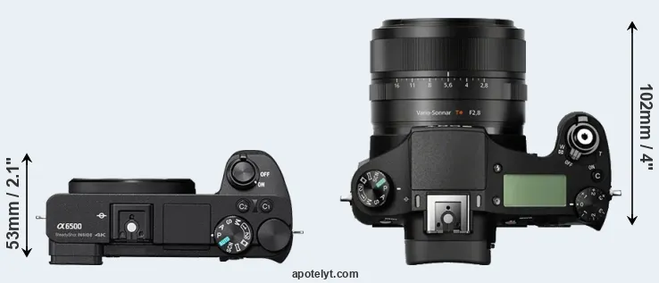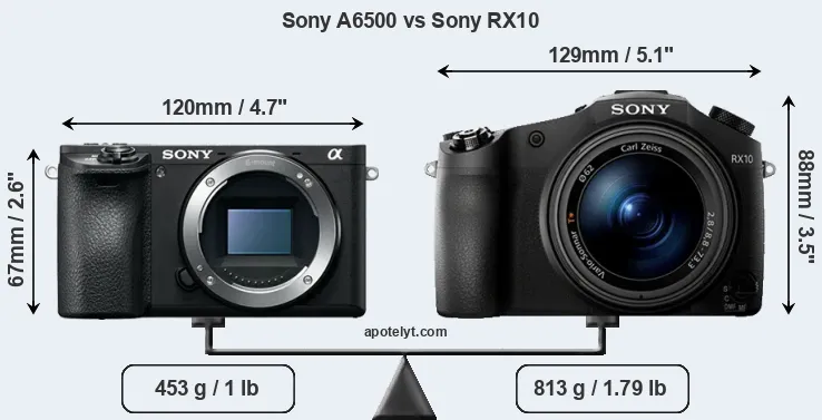 The side-by-side display below illustrates the physical size and weight of the Sony A6500 and the Sony RX10. The two cameras are presented according to their relative size. Three consecutive views from the front, the top, and the rear side are shown. All width, height and depth dimensions are rounded to the nearest millimeter.