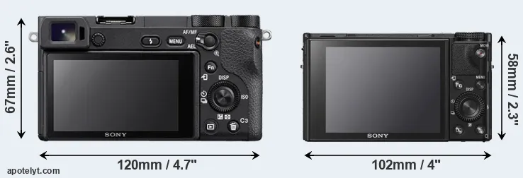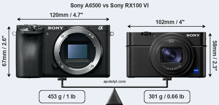 The side-by-side display below illustrates the physical size and weight of the Sony A6500 and the Sony RX100 VI. The two cameras are presented according to their relative size. Three successive views from the front, the top, and the rear are shown. All size dimensions are rounded to the nearest millimeter.