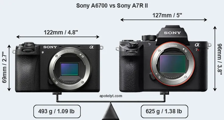 If the front view area (width x height) of the cameras is taken as an aggregate measure of their size, the Sony A7R II is considerably larger (45 percent) than the Sony A6700. Moreover, the A7R II is markedly heavier (27 percent) than the A6700. In this context, it is worth noting that both cameras are splash and dust-proof and can, hence, be used in inclement weather conditions or harsh environments.