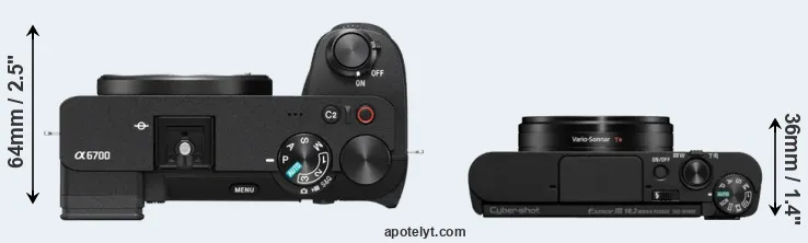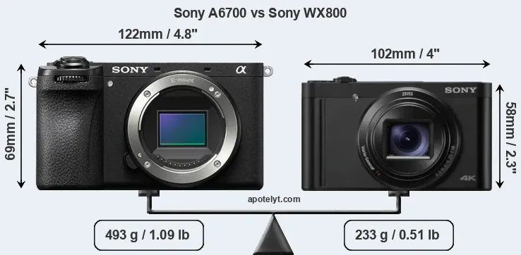 The side-by-side display below illustrates the physical size and weight of the Sony A6700 and the Sony WX800. The two cameras are presented according to their relative size. Three consecutive perspectives from the front, the top, and the back are available. All width, height and depth measures are rounded to the nearest millimeter.
