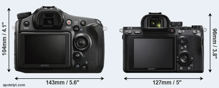 If the front view area (width x height) of the cameras is taken as an aggregate measure of their size, the Sony A7 III is notably smaller (18 percent) than the Sony A68. However, the A7 III is markedly heavier (7 percent) than the A68. It is noteworthy in this context that the A7 III is splash and dust-proof, while the A68 does not feature any corresponding weather-sealing.