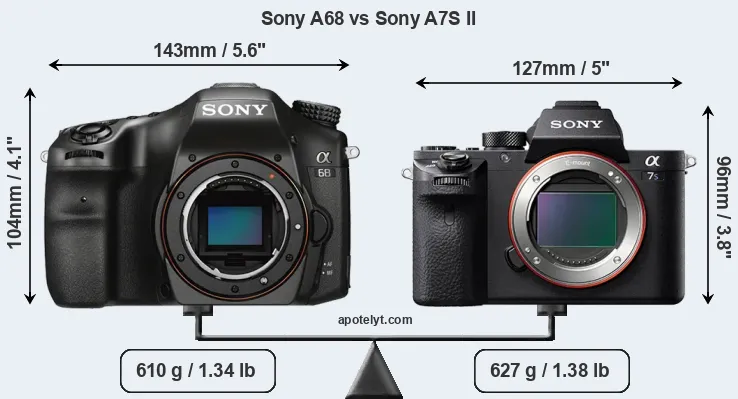 The side-by-side display below illustrates the physical size and weight of the Sony A68 and the Sony A7S II. The two cameras are presented according to their relative size. Three consecutive perspectives from the front, the top, and the back are available. All size dimensions are rounded to the nearest millimeter.