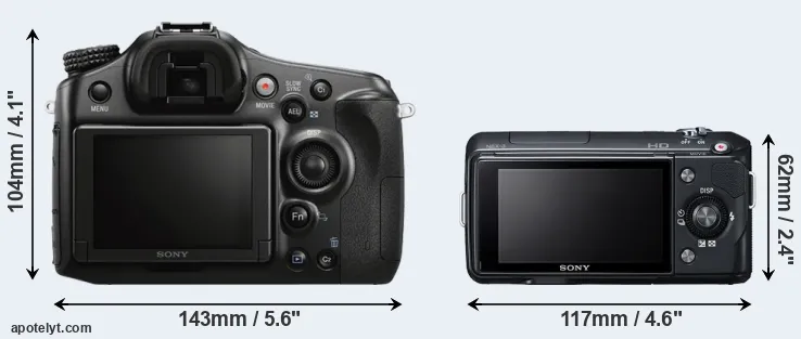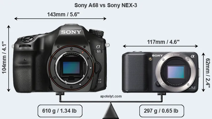 The side-by-side display below illustrates the physical size and weight of the Sony A68 and the Sony NEX-3. The two cameras are presented according to their relative size. Three successive views from the front, the top, and the rear are shown. All width, height and depth dimensions are rounded to the nearest millimeter.