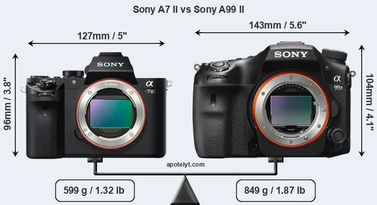 If the front view area (width x height) of the cameras is taken as an aggregate measure of their size, the Sony A99 II is notably larger (22 percent) than the Sony A7 II. Moreover, the A99 II is substantially heavier (42 percent) than the A7 II. In this context, it is worth noting that both cameras are splash and dust-proof and can, hence, be used in inclement weather conditions or harsh environments.