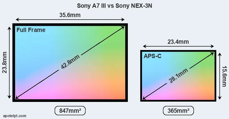Of the two cameras under consideration, the Sony A7 III features a full frame sensor and the Sony NEX-3N an APS-C sensor. The sensor area in the NEX-3N is 57 percent smaller. As a result of these sensor size differences, the cameras have a format factor of, respectively, 1.0 and 1.5. Both cameras have a native aspect ratio (sensor width to sensor height) of 3:2.