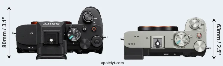 An illustration of the physical size and weight of the Sony A7 IV and the Sony A7C II is provided in the side-by-side display below. The two cameras are presented according to their relative size. Three consecutive views from the front, the top, and the rear side are shown. All width, height and depth measures are rounded to the nearest millimeter.
