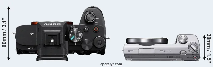 An illustration of the physical size and weight of the Sony A7 IV and the Sony NEX-5 is provided in the side-by-side display below. The two cameras are presented according to their relative size. Three consecutive perspectives from the front, the top, and the back are available. All size dimensions are rounded to the nearest millimeter.