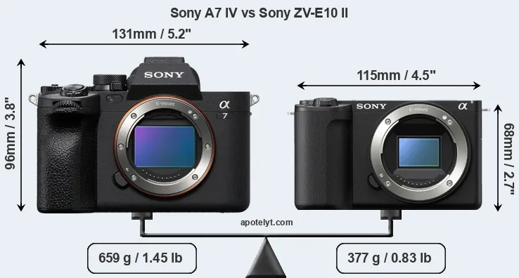 The physical size and weight of the Sony A7 IV and the Sony ZV-E10 II are illustrated in the side-by-side display below. The two cameras are presented according to their relative size. Three consecutive perspectives from the front, the top, and the back are available. All width, height and depth dimensions are rounded to the nearest millimeter.