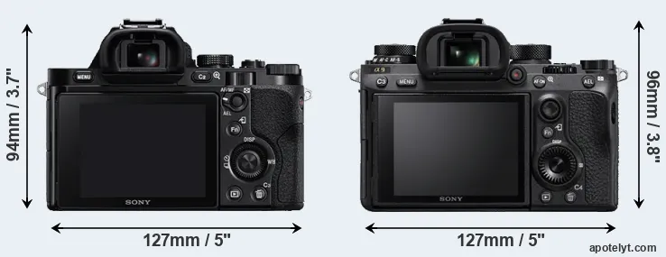 An illustration of the physical size and weight of the Sony A7 and the Sony A9 is provided in the side-by-side display below. The two cameras are presented according to their relative size. Three consecutive views from the front, the top, and the rear side are shown. All width, height and depth measures are rounded to the nearest millimeter.