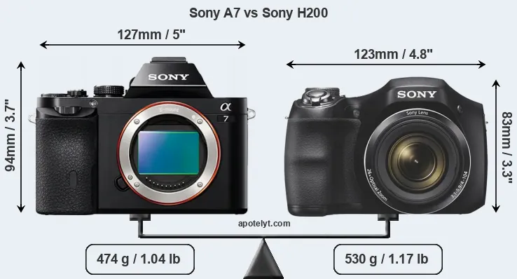 The Sony Alpha A7 and the Sony Cyber-shot DSC-H200 are two digital cameras that were announced, respectively, in October 2013 and January 2013. The A7 is a mirrorless interchangeable lens camera, while the H200 is a fixed lens compact. The cameras are based on a full frame (A7) and a 1/2.3-inch (H200) sensor. The A7 has a resolution of 24 megapixels, whereas the H200 provides 15.2 MP.