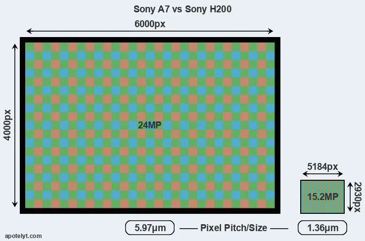 With 24MP, the A7 offers a higher resolution than the H200 (15.2MP), but the A7 nevertheless has larger individual pixels (pixel pitch of 5.97μm versus 1.36μm for the H200) due to its larger sensor. Moreover, the A7 is a somewhat more recent model (by 9 months) than the H200, and its sensor might have benefitted from technological advances during this time that further enhance the light gathering capacity of its pixels. Coming back to sensor resolution, it should be mentioned that the H200 has no anti-alias filter installed, so that it can capture all the detail its sensor resolves.