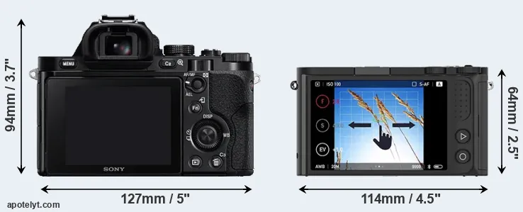 The physical size and weight of the Sony A7 and the YI M1 are illustrated in the side-by-side display below. The two cameras are presented according to their relative size. Three consecutive views from the front, the top, and the rear side are shown. All width, height and depth dimensions are rounded to the nearest millimeter.
