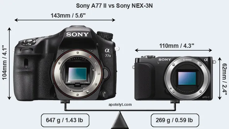 An illustration of the physical size and weight of the Sony A77 II and the Sony NEX-3N is provided in the side-by-side display below. The two cameras are presented according to their relative size. Three successive views from the front, the top, and the rear are shown. All width, height and depth dimensions are rounded to the nearest millimeter.