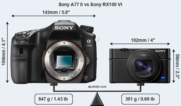 The above size and weight comparisons are to some extent incomplete and possibly misleading, as the RX100 VI has a lens built in, whereas the A77 II is an interchangeable lens camera that requires a separate lens. Attaching the latter will add extra weight and bulk to the setup.