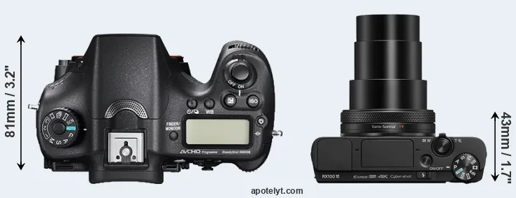 The side-by-side display below illustrates the physical size and weight of the Sony A77 II and the Sony RX100 VI. The two cameras are presented according to their relative size. Three consecutive views from the front, the top, and the rear side are shown. All width, height and depth dimensions are rounded to the nearest millimeter.