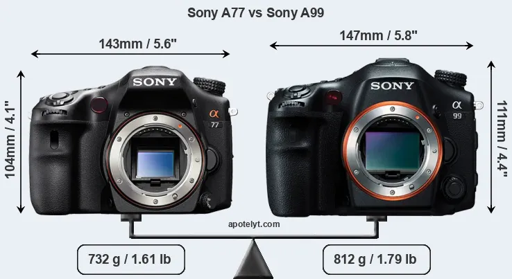 An illustration of the physical size and weight of the Sony A77 and the Sony A99 is provided in the side-by-side display below. The two cameras are presented according to their relative size. Three consecutive perspectives from the front, the top, and the back are available. All width, height and depth measures are rounded to the nearest millimeter.