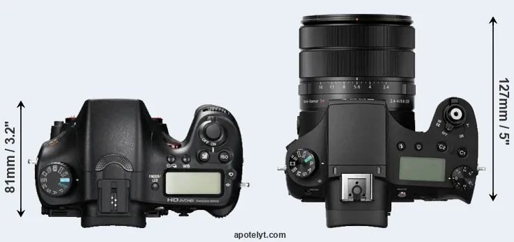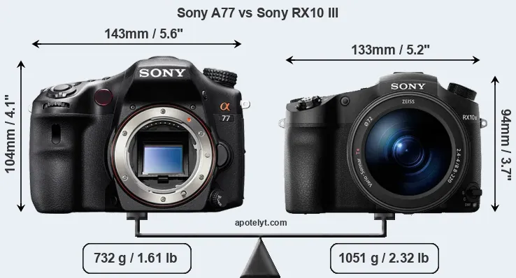 The side-by-side display below illustrates the physical size and weight of the Sony A77 and the Sony RX10 III. The two cameras are presented according to their relative size. Three consecutive perspectives from the front, the top, and the back are available. All width, height and depth dimensions are rounded to the nearest millimeter.