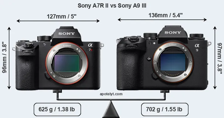 An illustration of the physical size and weight of the Sony A7R II and the Sony A9 III is provided in the side-by-side display below. The two cameras are presented according to their relative size. Three successive views from the front, the top, and the rear are shown. All width, height and depth measures are rounded to the nearest millimeter.