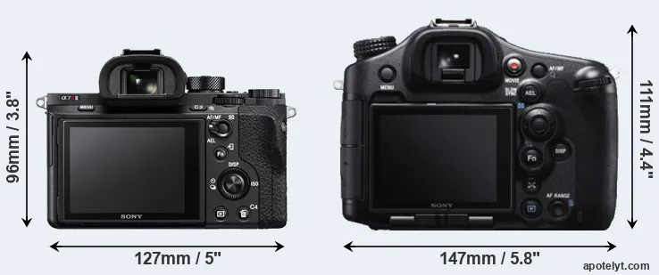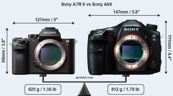 The physical size and weight of the Sony A7R II and the Sony A99 are illustrated in the side-by-side display below. The two cameras are presented according to their relative size. Three consecutive views from the front, the top, and the rear side are shown. All size dimensions are rounded to the nearest millimeter.