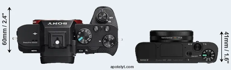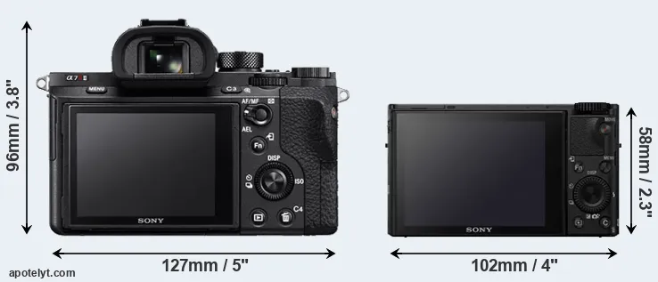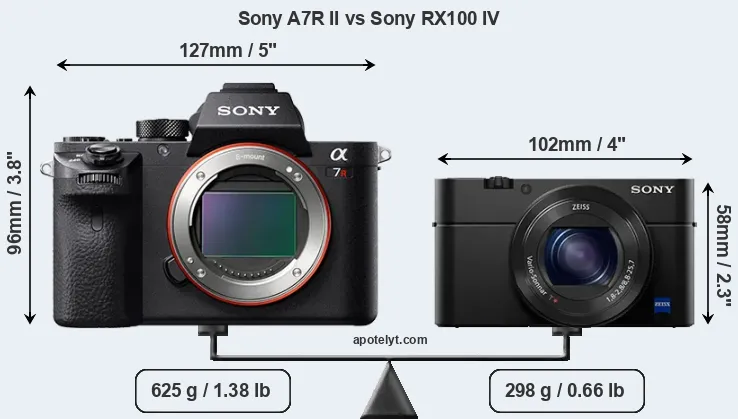 An illustration of the physical size and weight of the Sony A7R II and the Sony RX100 IV is provided in the side-by-side display below. The two cameras are presented according to their relative size. Three successive views from the front, the top, and the rear are shown. All width, height and depth measures are rounded to the nearest millimeter.