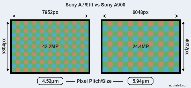 While the two cameras under review share the same sensor size, the A7R III offers a higher resolution of 42.2 megapixels, compared with 24.4 MP of the A900. This megapixels advantage translates into a 31 percent gain in linear resolution. On the other hand, these sensor specs imply that the A7R III has a higher pixel density and a smaller size of the individual pixel (with a pixel pitch of 4.52μm versus 5.94μm for the A900). In this context, it should be noted, however, that the A7R III is much more recent (by 9 years and 1 month) than the A900, and its sensor will have benefitted from technological advances during this time that compensate for the smaller pixel size. Coming back to sensor resolution, it should be mentioned that the A7R III has no anti-alias filter installed, so that it can capture all the detail its sensor resolves.