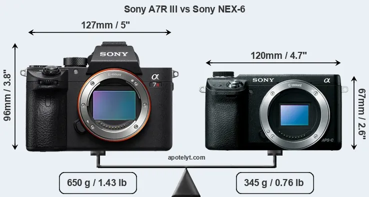 If the front view area (width x height) of the cameras is taken as an aggregate measure of their size, the Sony NEX-6 is considerably smaller (34 percent) than the Sony A7R III. Moreover, the NEX-6 is substantially lighter (47 percent) than the A7R III. It is worth mentioning in this context that the A7R III is splash and dust resistant, while the NEX-6 does not feature any corresponding weather-sealing.