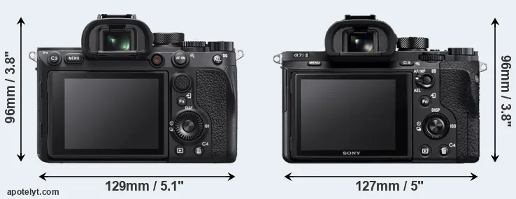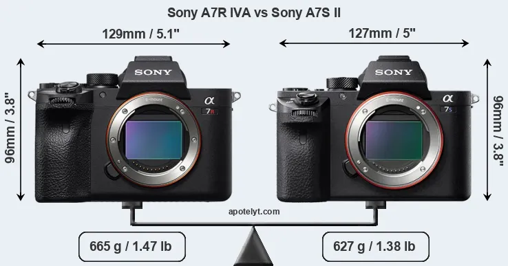 The physical size and weight of the Sony A7R IVA and the Sony A7S II are illustrated in the side-by-side display below. The two cameras are presented according to their relative size. Three consecutive perspectives from the front, the top, and the back are available. All width, height and depth measures are rounded to the nearest millimeter.