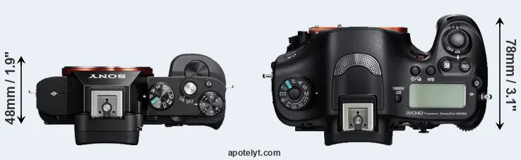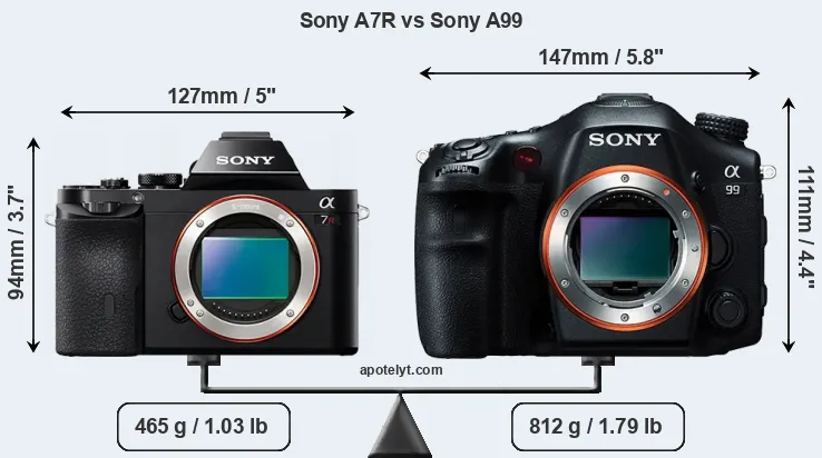 The physical size and weight of the Sony A7R and the Sony A99 are illustrated in the side-by-side display below. The two cameras are presented according to their relative size. Three consecutive views from the front, the top, and the rear side are shown. All size dimensions are rounded to the nearest millimeter.