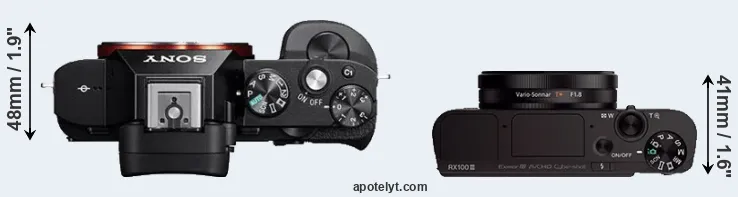 If the front view area (width x height) of the cameras is taken as an aggregate measure of their size, the Sony RX100 III is considerably smaller (50 percent) than the Sony A7R. It is worth mentioning in this context that the A7R is splash and dust resistant, while the RX100 III does not feature any corresponding weather-sealing.