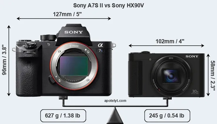 The Sony Alpha 7S II and the Sony Cyber-shot DSC-HX90V are two digital cameras that were revealed to the public, respectively, in September 2015 and April 2015. The A7S II is a mirrorless interchangeable lens camera, while the HX90V is a fixed lens compact. The cameras are based on a full frame (A7S II) and a 1/2.3-inch (HX90V) sensor. The A7S II has a resolution of 12 megapixels, whereas the HX90V provides 18 MP.