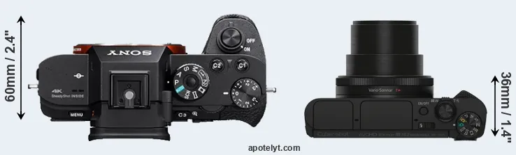 The physical size and weight of the Sony A7S II and the Sony HX90V are illustrated in the side-by-side display below. The two cameras are presented according to their relative size. Three consecutive views from the front, the top, and the rear side are shown. All width, height and depth measures are rounded to the nearest millimeter.