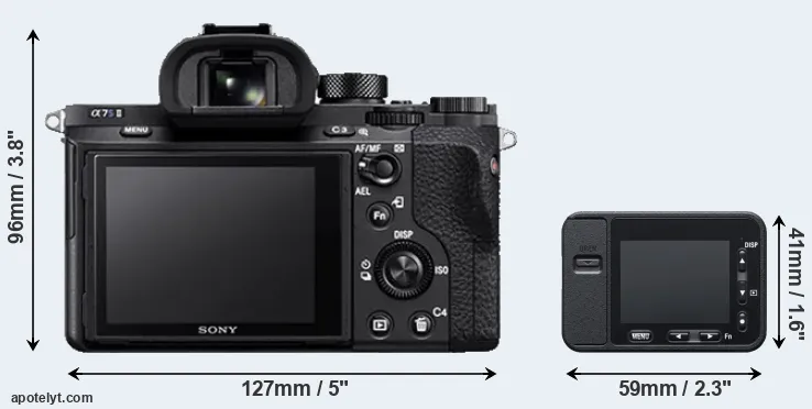 An illustration of the physical size and weight of the Sony A7S II and the Sony RX0 is provided in the side-by-side display below. The two cameras are presented according to their relative size. Three successive views from the front, the top, and the rear are shown. All width, height and depth dimensions are rounded to the nearest millimeter.