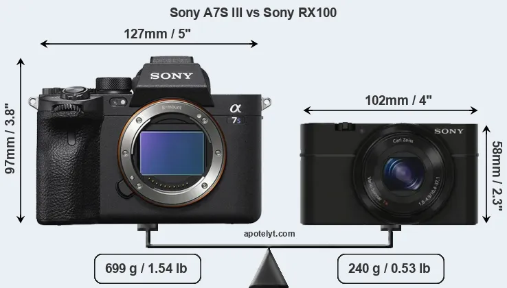 The above size and weight comparisons are to some extent incomplete and possibly misleading, as the RX100 has a lens built in, whereas the A7S III is an interchangeable lens camera that requires a separate lens. Attaching the latter will add extra weight and bulk to the setup. You can compare the optics available for the A7S III and their specifications in the Sony FE Lens Catalog.