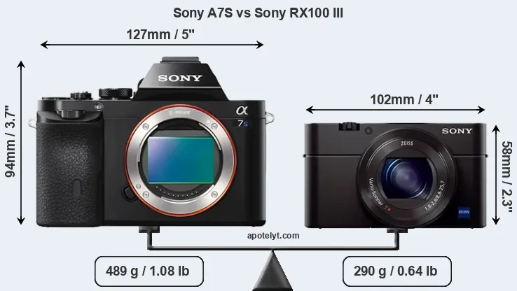 If the front view area (width x height) of the cameras is taken as an aggregate measure of their size, the Sony RX100 III is considerably smaller (50 percent) than the Sony A7S. It is worth mentioning in this context that the A7S is splash and dust resistant, while the RX100 III does not feature any corresponding weather-sealing.