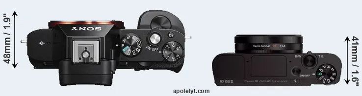 An illustration of the physical size and weight of the Sony A7S and the Sony RX100 III is provided in the side-by-side display below. The two cameras are presented according to their relative size. Three consecutive views from the front, the top, and the rear side are shown. All width, height and depth dimensions are rounded to the nearest millimeter.