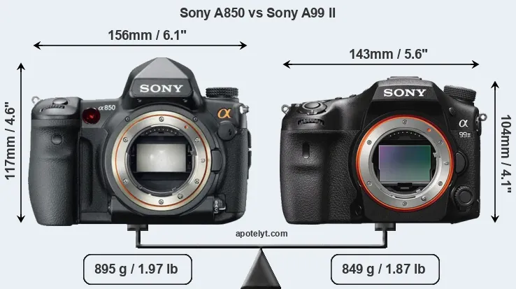 An illustration of the physical size and weight of the Sony A850 and the Sony A99 II is provided in the side-by-side display below. The two cameras are presented according to their relative size. Three successive views from the front, the top, and the rear are shown. All width, height and depth dimensions are rounded to the nearest millimeter.