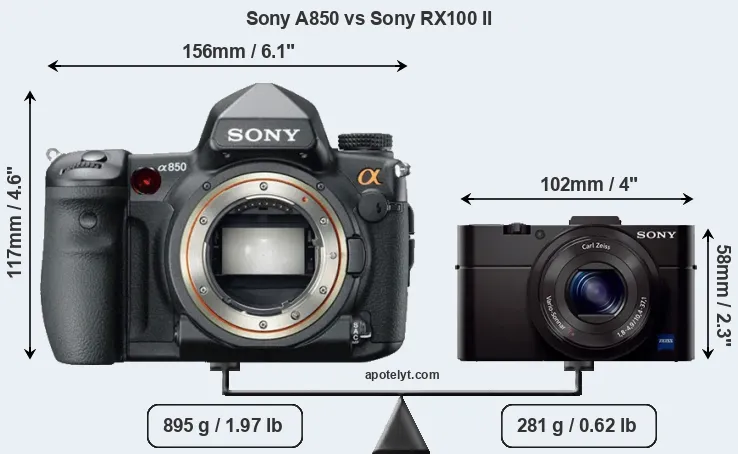 The side-by-side display below illustrates the physical size and weight of the Sony A850 and the Sony RX100 II. The two cameras are presented according to their relative size. Three consecutive perspectives from the front, the top, and the back are available. All width, height and depth measures are rounded to the nearest millimeter.