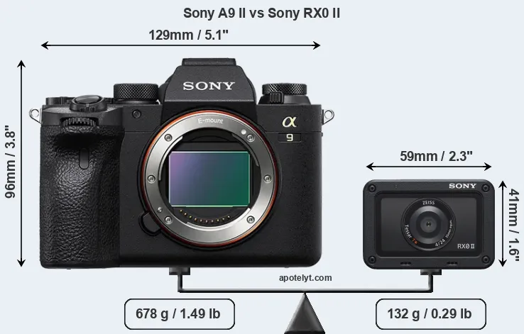 The above size and weight comparisons are to some extent incomplete and possibly misleading, as the RX0 II has a lens built in, whereas the A9 II is an interchangeable lens camera that requires a separate lens. Attaching the latter will add extra weight and bulk to the setup. You can compare the optics available for the A9 II and their specifications in the Sony FE Lens Catalog.