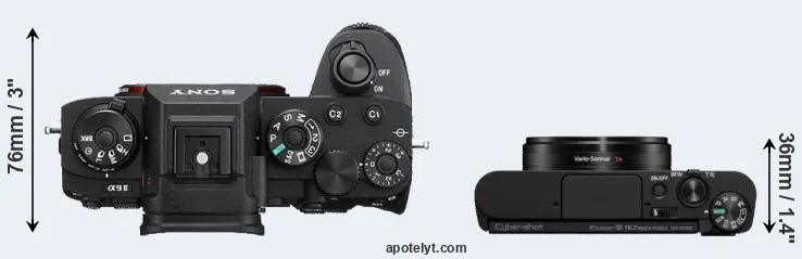 The physical size and weight of the Sony A9 II and the Sony WX800 are illustrated in the side-by-side display below. The two cameras are presented according to their relative size. Three consecutive perspectives from the front, the top, and the back are available. All width, height and depth measures are rounded to the nearest millimeter.