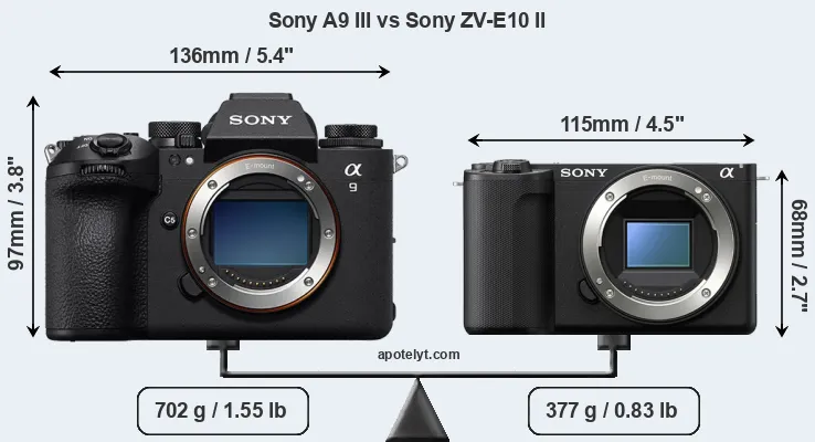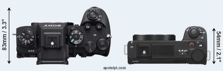 The side-by-side display below illustrates the physical size and weight of the Sony A9 III and the Sony ZV-E10 II. The two cameras are presented according to their relative size. Three successive views from the front, the top, and the rear are shown. All width, height and depth dimensions are rounded to the nearest millimeter.