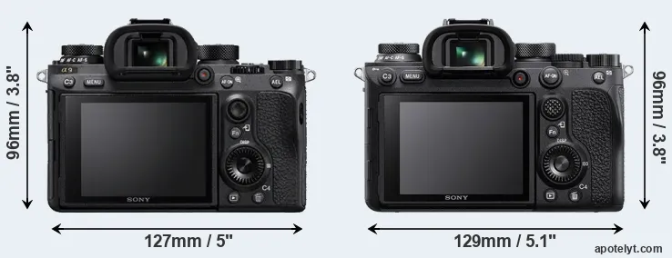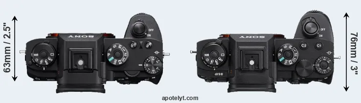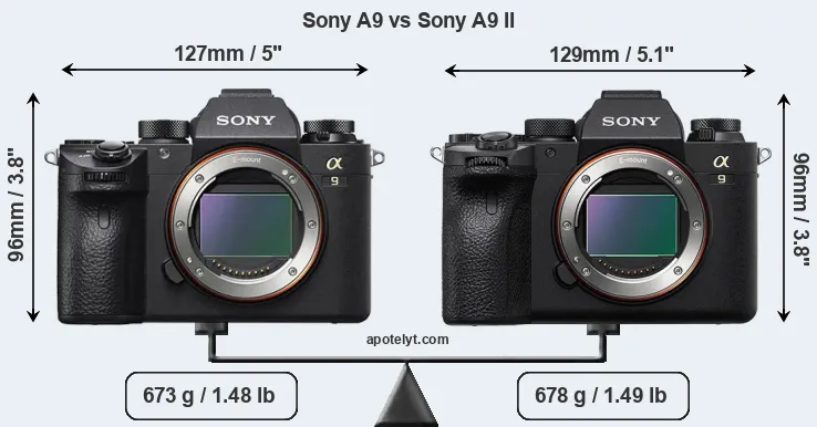 The side-by-side display below illustrates the physical size and weight of the Sony A9 and the Sony A9 II. The two cameras are presented according to their relative size. Three consecutive perspectives from the front, the top, and the back are available. All width, height and depth dimensions are rounded to the nearest millimeter.