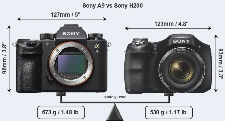 The side-by-side display below illustrates the physical size and weight of the Sony A9 and the Sony H200. The two cameras are presented according to their relative size. Three successive views from the front, the top, and the rear are shown. All size dimensions are rounded to the nearest millimeter.