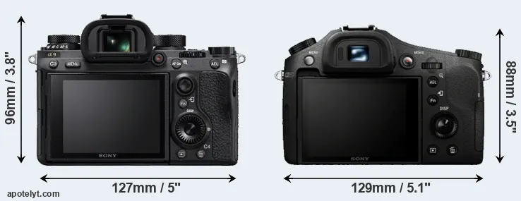 The physical size and weight of the Sony A9 and the Sony RX10 are illustrated in the side-by-side display below. The two cameras are presented according to their relative size. Three consecutive perspectives from the front, the top, and the back are available. All width, height and depth dimensions are rounded to the nearest millimeter.