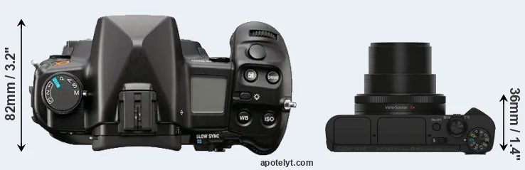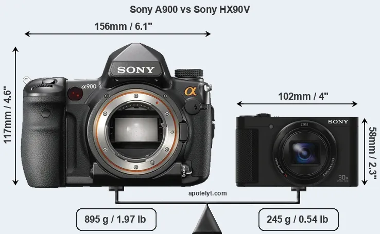 The side-by-side display below illustrates the physical size and weight of the Sony A900 and the Sony HX90V. The two cameras are presented according to their relative size. Three consecutive views from the front, the top, and the rear side are shown. All width, height and depth measures are rounded to the nearest millimeter.