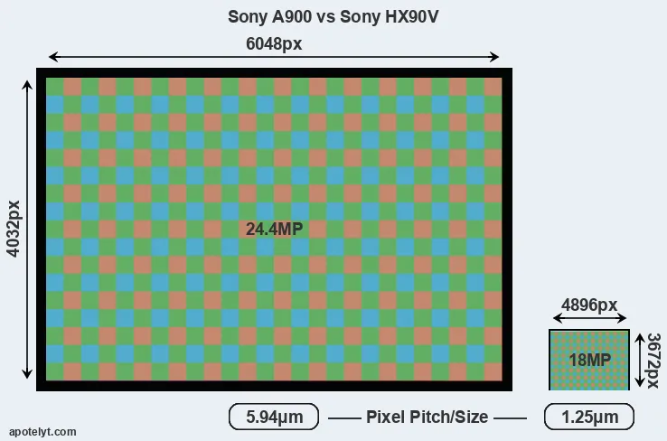 Of the two cameras under consideration, the Sony A900 features a full frame sensor and the Sony HX90V a 1/2.3-inch sensor. The sensor area in the HX90V is 97 percent smaller. As a result of these sensor size differences, the cameras have a format factor of, respectively, 1.0 and 5.6. The sensor in the A900 has a native 3:2 aspect ratio, while the one in the HX90V offers a 4:3 aspect.