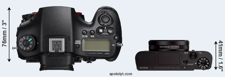 An illustration of the physical size and weight of the Sony A99 II and the Sony RX100 III is provided in the side-by-side display below. The two cameras are presented according to their relative size. Three successive views from the front, the top, and the rear are shown. All width, height and depth dimensions are rounded to the nearest millimeter.