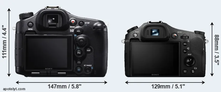 The physical size and weight of the Sony A99 and the Sony RX10 II are illustrated in the side-by-side display below. The two cameras are presented according to their relative size. Three consecutive perspectives from the front, the top, and the back are available. All width, height and depth dimensions are rounded to the nearest millimeter.