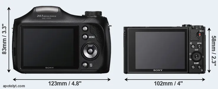 The side-by-side display below illustrates the physical size and weight of the Sony H200 and the Sony HX95. The two cameras are presented according to their relative size. Three consecutive perspectives from the front, the top, and the back are available. All width, height and depth dimensions are rounded to the nearest millimeter.
