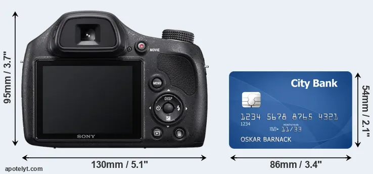 The physical dimensions of the Sony H400 relative to a credit card are illustrated in the side-by-side display below. Three consecutive perspectives from the front, the top, and the back are presented. All width, height and depth dimensions are rounded to the nearest millimeter.